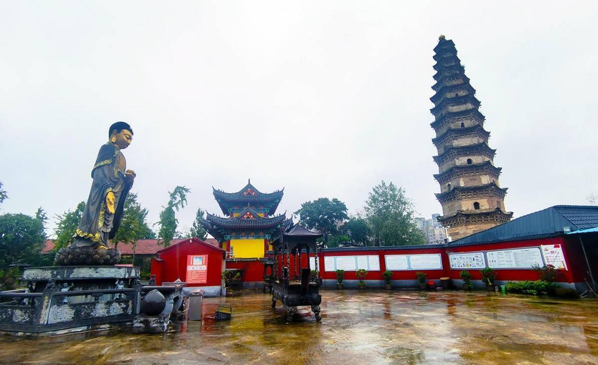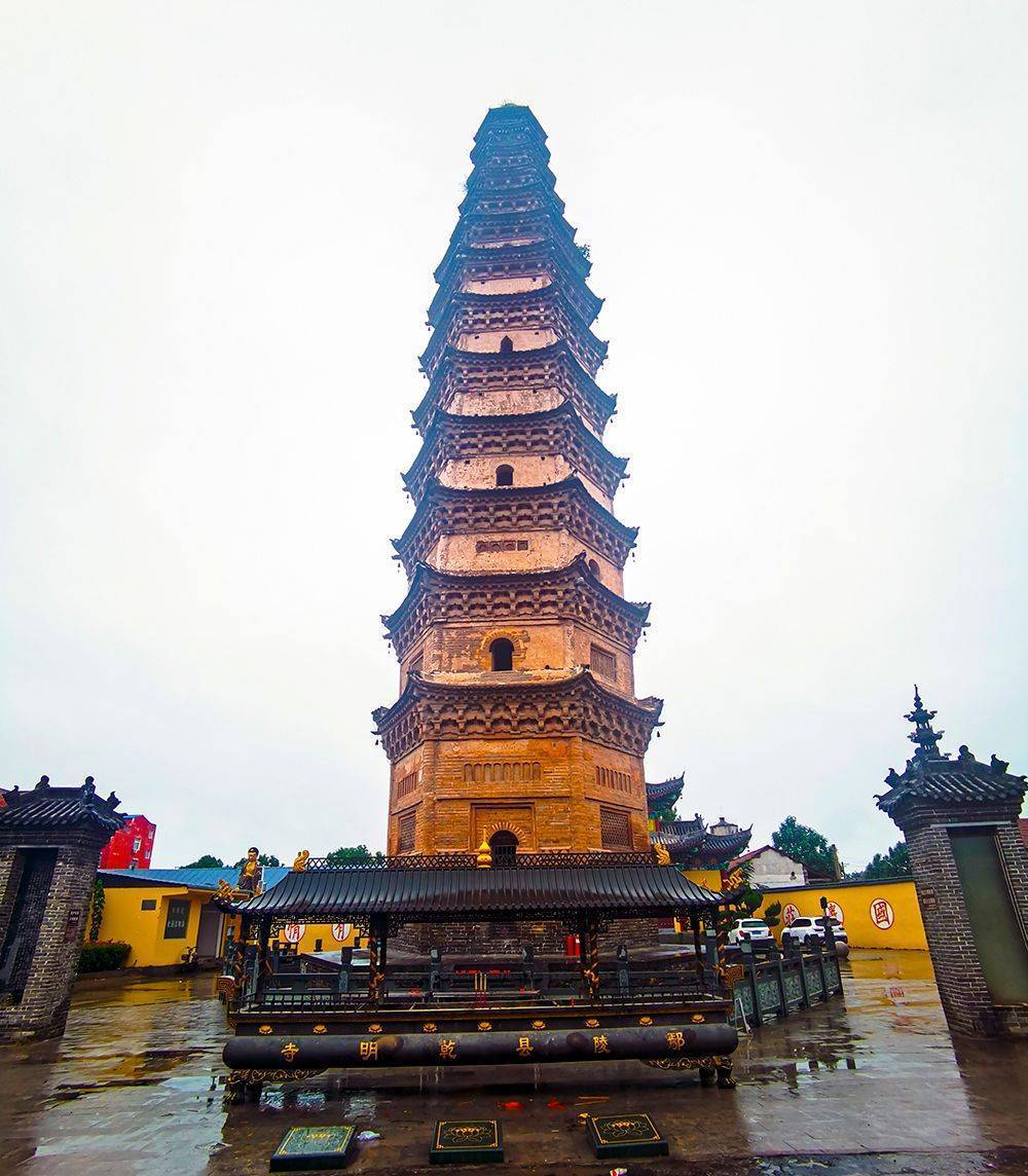 雨刷轻扫前窗,将远处的田畴与林木晕成淡墨画,待车停在寺前,雨势仍缓,细密得像筛过的银线。不必撑伞,任雨丝落在发间,沾湿衣角,倒添了几分与古寺相融的闲意。青石板路被雨水浸得发亮,倒映着高大古塔的轮廓,塔前还能瞥见往日香客往来的痕迹。